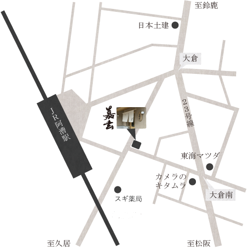 来店のご案内 お乗り合わせでご来店いただけない場合はご入店をお断りさせていただく場合がございます。 ご来店の際は国道23号線、カメラのキタムラの交差点を阿漕駅方面に曲がっていただくルートが最適です。 電話 059-253-7341 ※ご予約は受けておりません、ご了承ください。 〒514-0834 三重県津市大倉10-4 定休日:毎週日曜日、第1月曜がお休みとなる場合がございます ※夜の部は水曜、木曜、土曜のみ営業 昼 11:30~14:00(オーダーストップ13:30) 夜 17:30~20:00(オーダーストップ19:30) テーブル 28席 座敷 12席 カウンター 5席